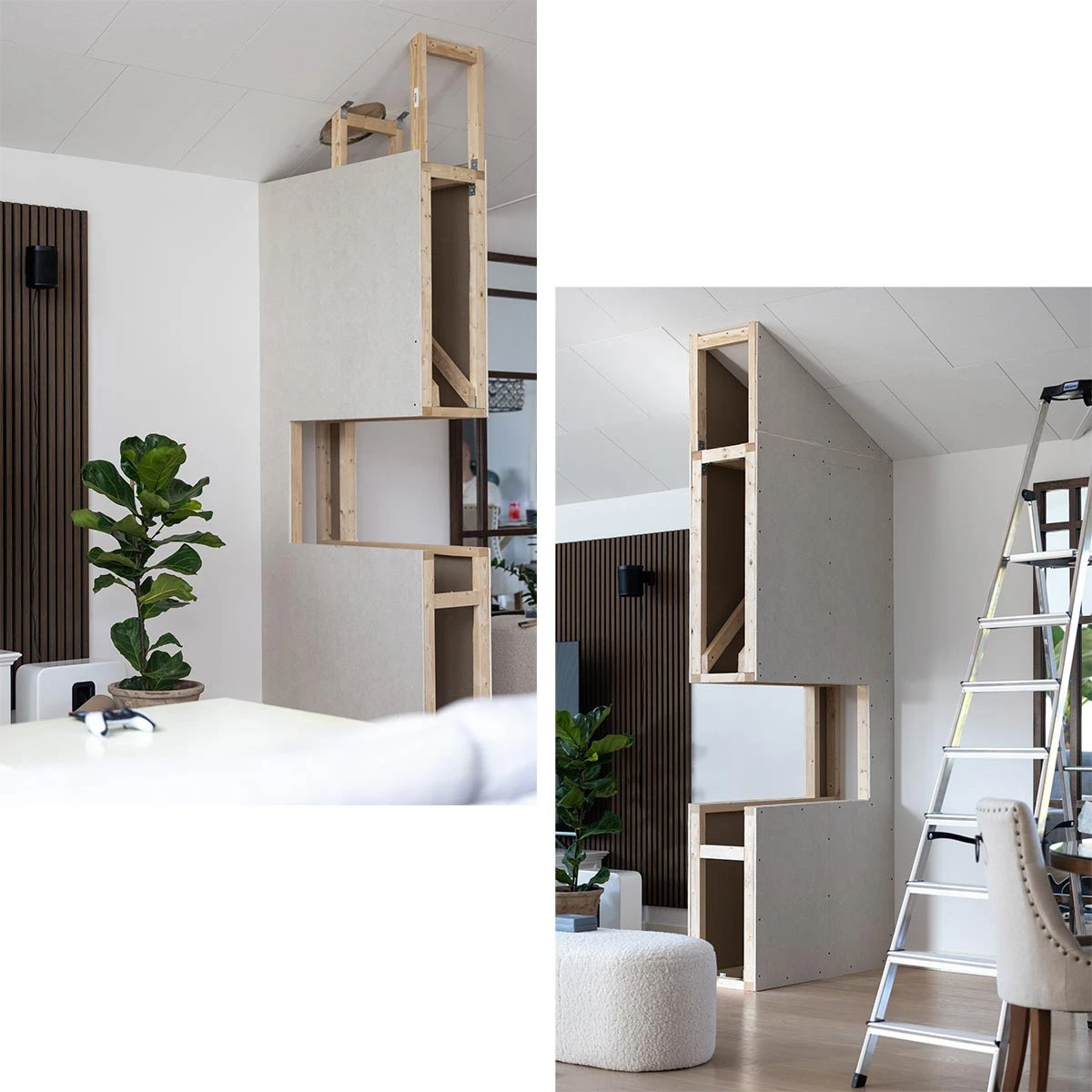 W konstrukcji takiej jak w tym przykładzie, wykonanej z płyt gipsowo-kartonowych, wszystkie szczeliny i pęknięcia należy wypełnić masą szpachlową i wygładzić papierem ściernym.