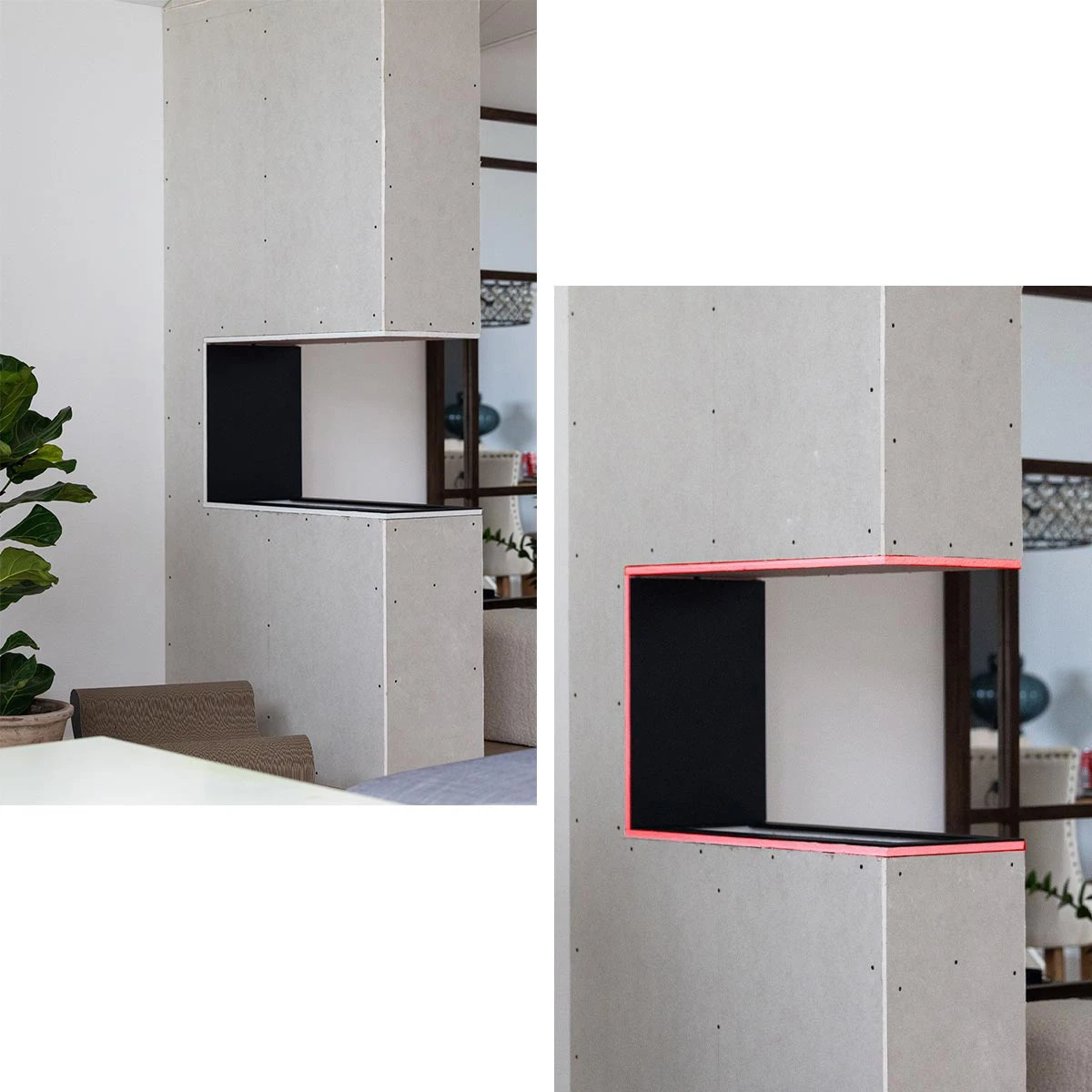 Jeśli ściana jest wykonana z materiałów łatwopalnych, takich jak drewno, między ramą ściany a ramą kominka należy dodać warstwę odpornego na ciepło materiału, jak pokazano na zdjęciu po prawej stronie.