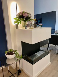 3-stronny kominek dzielący pomieszczenie, który można wbudować w ścianę i umożliwia oglądanie płomieni z trzech różnych stron. Wybierz spośród różnych standardowych wymiarów.